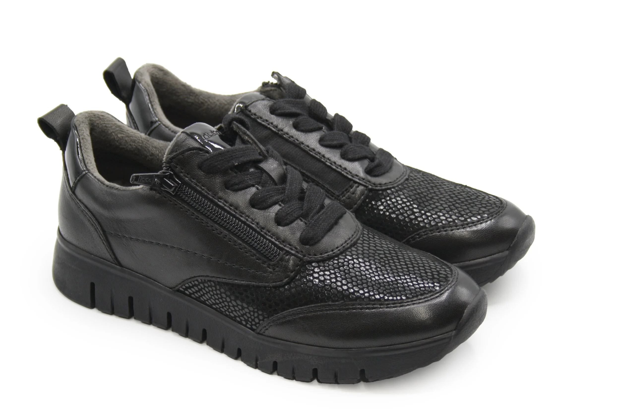 Remonte Ladies everyday shoe D0J04-60 is a women’s fashion trainers. Crafted from a unique combination of materials, these stylish trainers feature a chic animal print pattern that adds a playful twist to any outfit. The laced fastening ensures a snug, secure fit, while the wedge heel offers a subtle lift without sacrificing comfort. The flat heel design makes them perfect whether you’re out for a casual day or looking to add some flair to your ensemble.